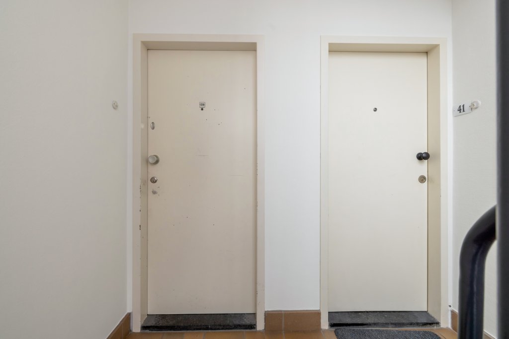 Well-maintained communal entrance with porch, mailboxes, access to private storage. Communal bicycle storage is on the other side of the public parking lot.