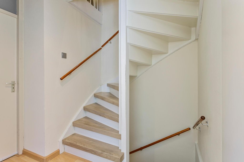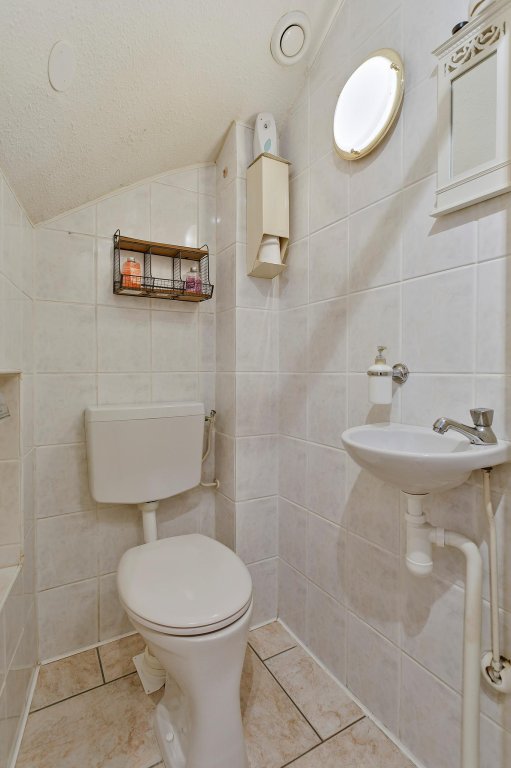 The entire ground floor has light tiles with underfloor heating. In the living room is the door to the upper floors. In the hall there is a toilet with an extra storage space. The stairs were completely renovated in 2020.