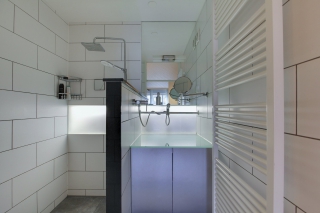 This luxurious bathroom has a shower with rain shower, thermostat, design sink and a design radiator. All this carried out with special LED lighting