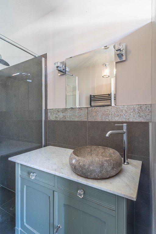 At the front of the home, a versatile room separated by original sliding doors offers the perfect space for a sitting room, bedroom, or home office. At the rear, the spacious master bedroom also provides direct access to the balcony through elegant sliding doors.