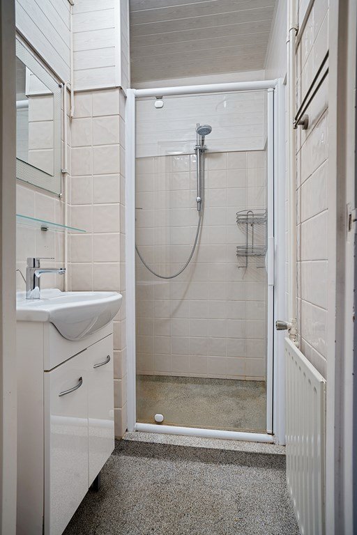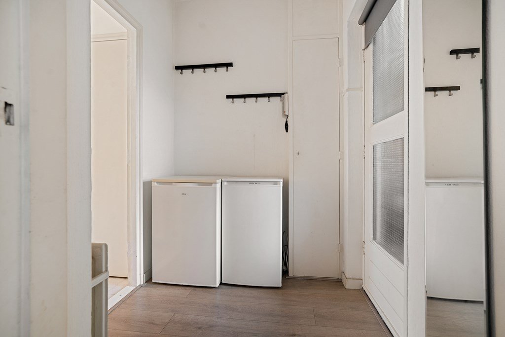 In the basement, the apartment includes a private storage room, ideal for bicycles and additional storage.