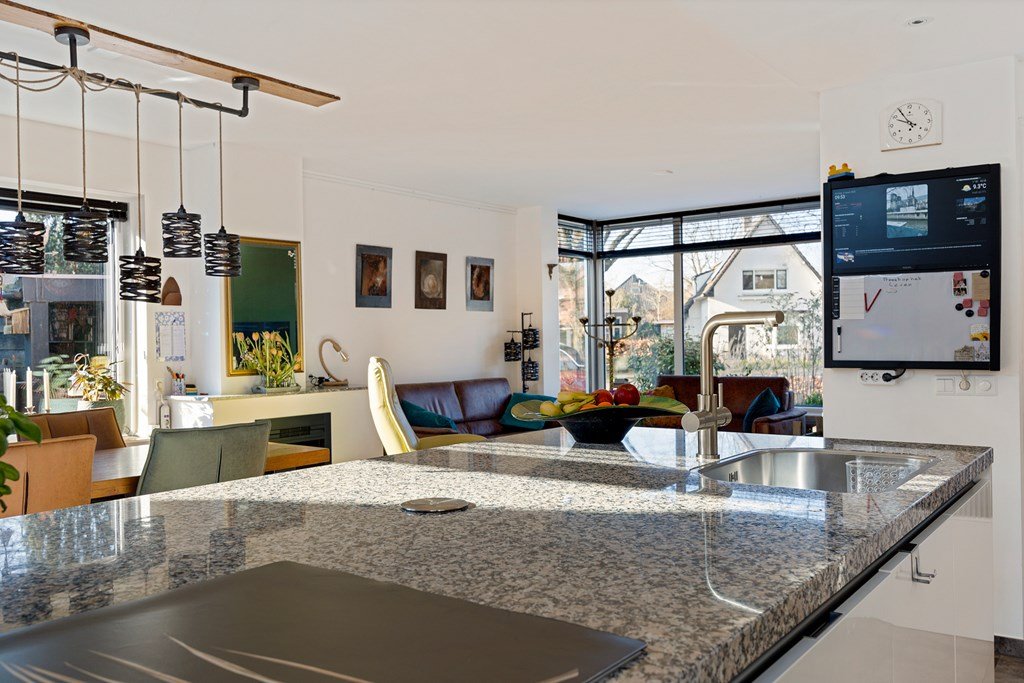 The modern open-plan kitchen with a cooking island is fully equipped with various built-in appliances, a Floww boiling water tap, a composite countertop, and ample storage space. Underfloor heating in the kitchen adds extra comfort.