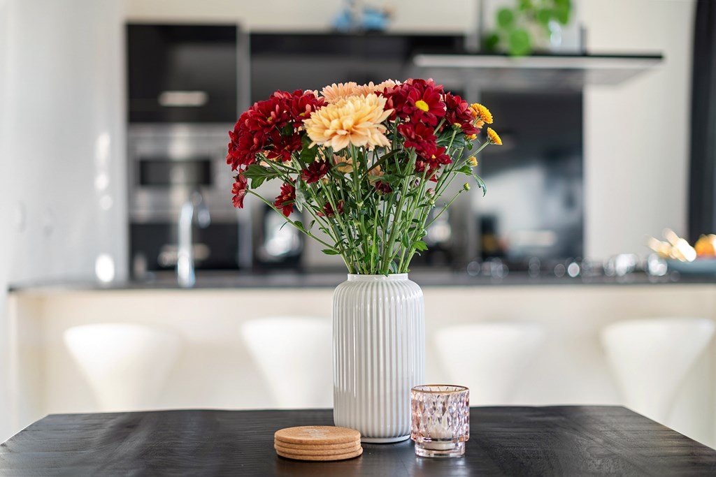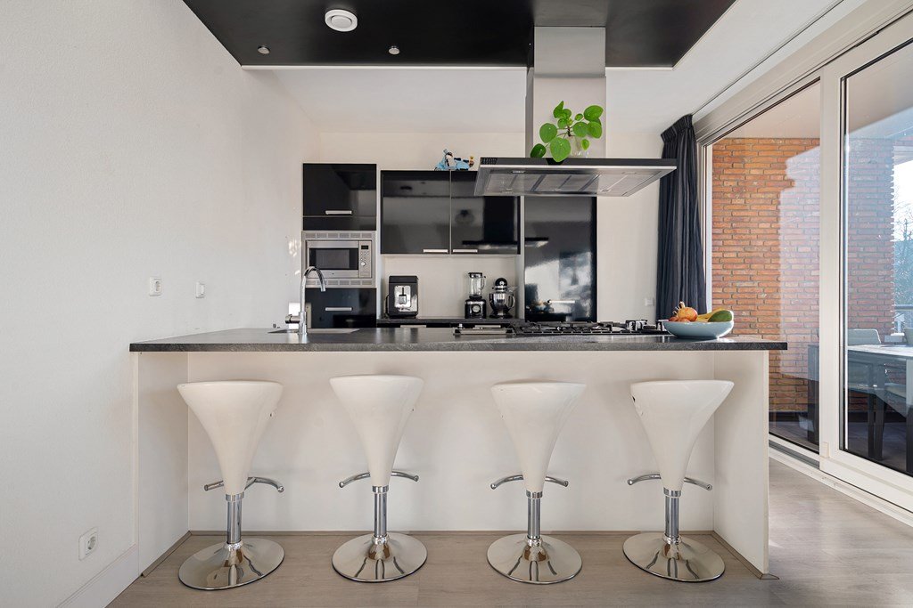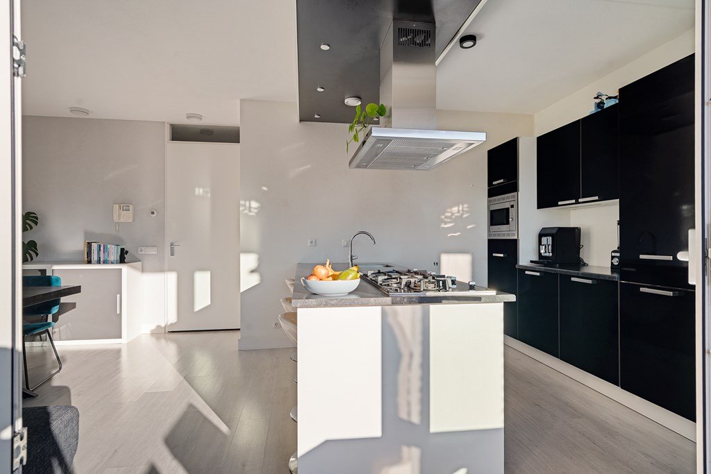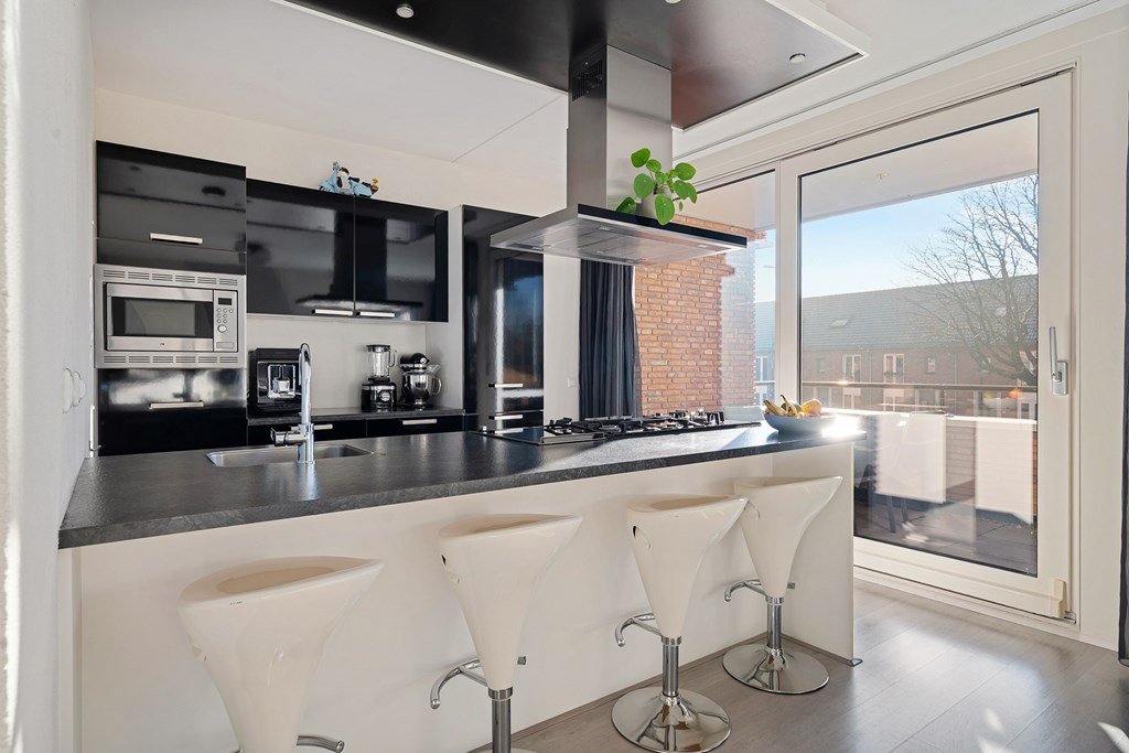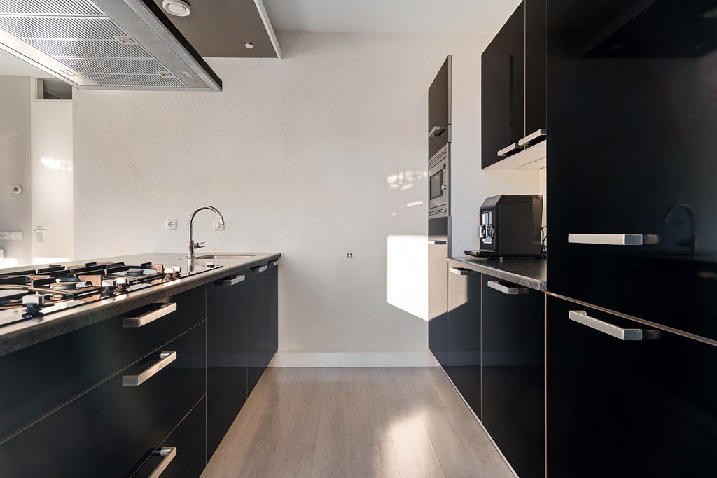 The living room is wonderfully bright thanks to the large windows and offers ample space for both a sitting and dining area. The open kitchen forms the heart of the space and is equipped with a modern kitchen island and various built-in appliances, including an extractor hood, a 5-burner gas hob (with a special wok burner and griddle), dishwasher, fridge-freezer combination, and a combi-oven. From the kitchen you can directly step onto the sunny south-facing balcony – a lovely place to relax and enjoy the sun.