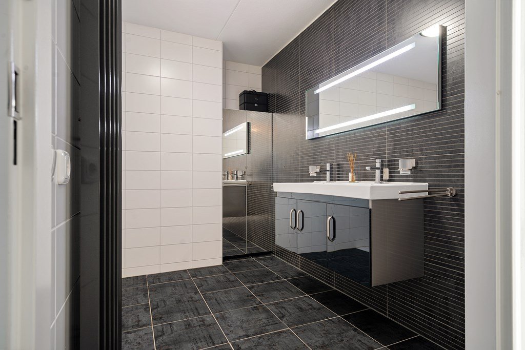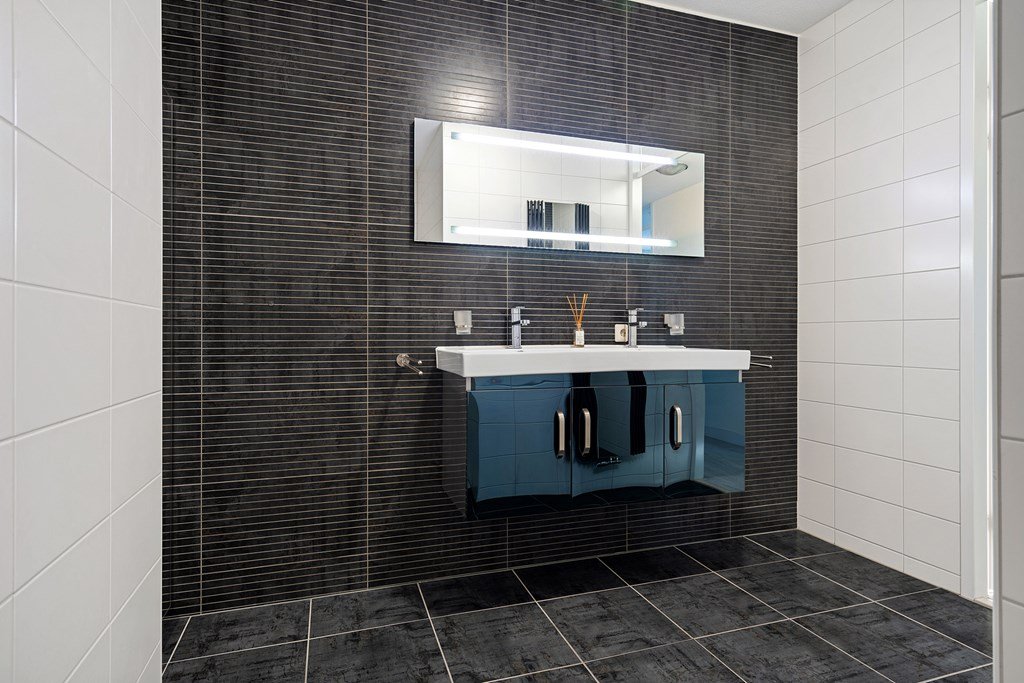 Spacious bathroom with walk-in shower and double washbasin