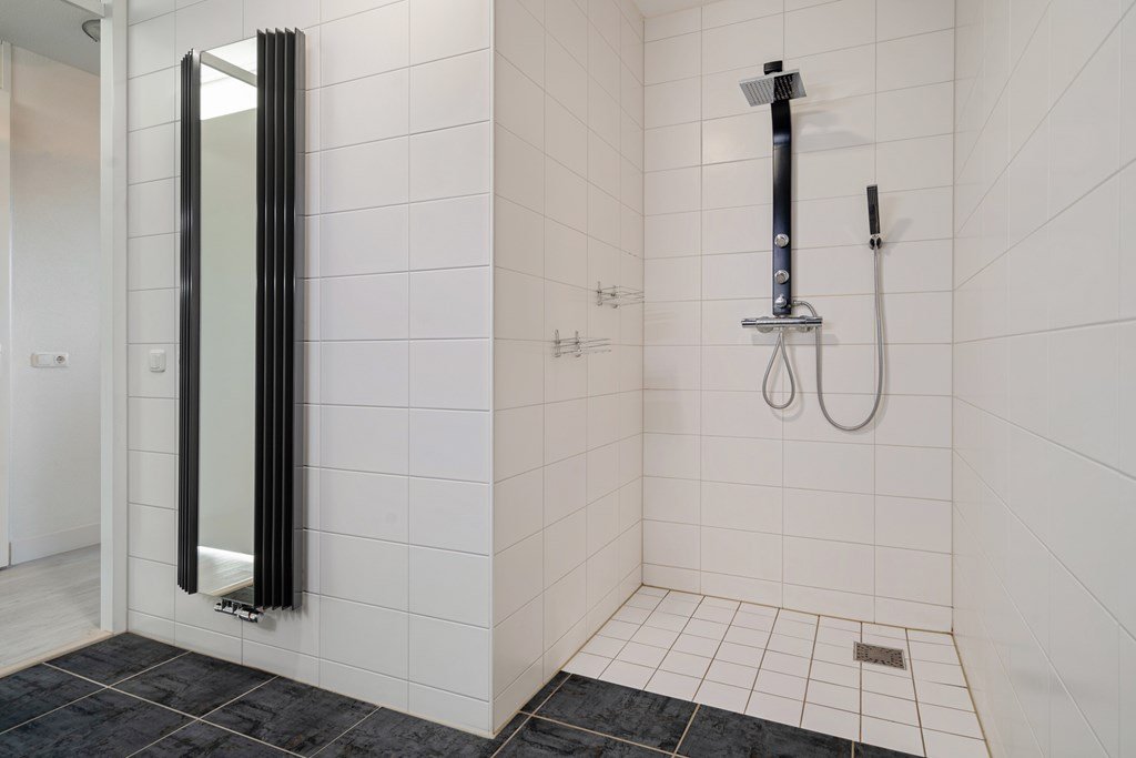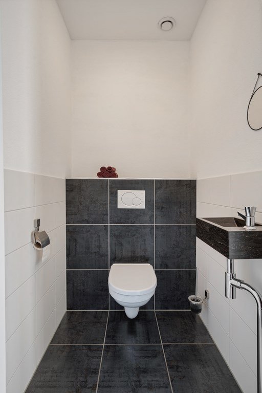 The bathroom is impressively spacious and fully equipped with a walk-in shower and double washbasin. The internal storage room offers additional storage space and houses the central heating boiler, the ventilation heat recovery system (WTW), and the washing machine connection.