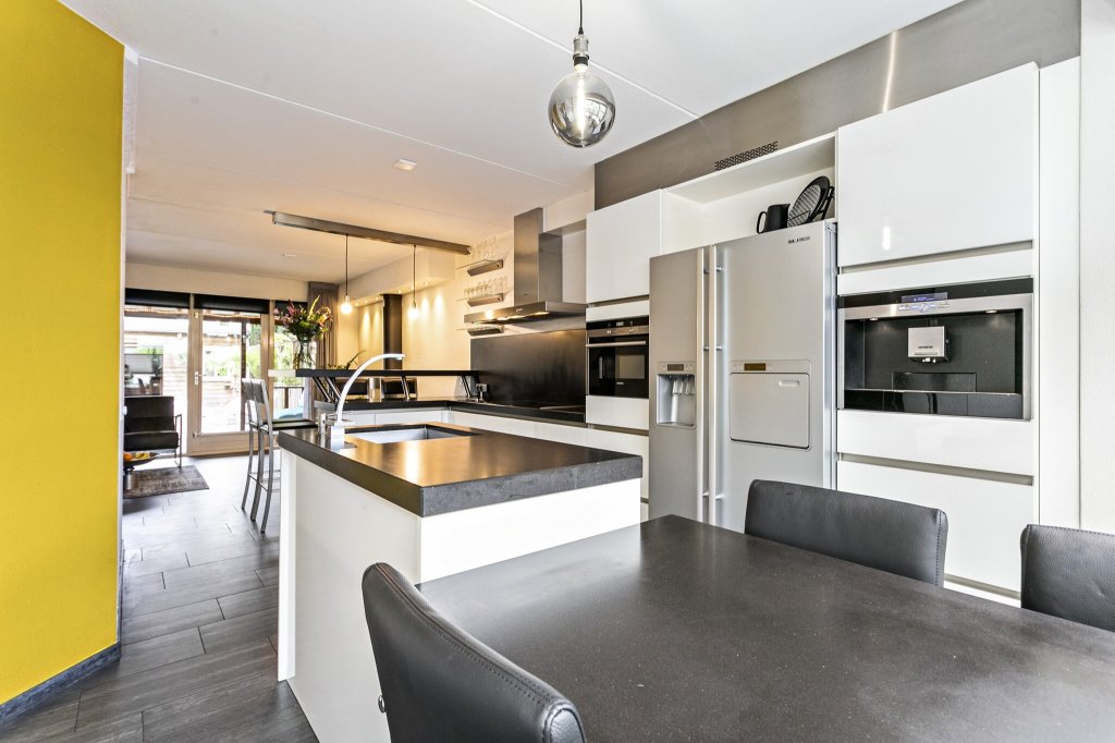 Through the front door we enter the hall where the meter cupboard and the modern renovated toilet are located. The passage to the kitchen immediately gives a pleasant surprise. The large, modern white kitchen with an anthracite granite worktop is equipped with a dishwasher, a ceramic hob, an extractor hood, a built-in grill, a combination oven / microwave, an American fridge-freezer (with ice maker), a built-in coffee machine, a breakfast bar and a washing island with a dining table attached.