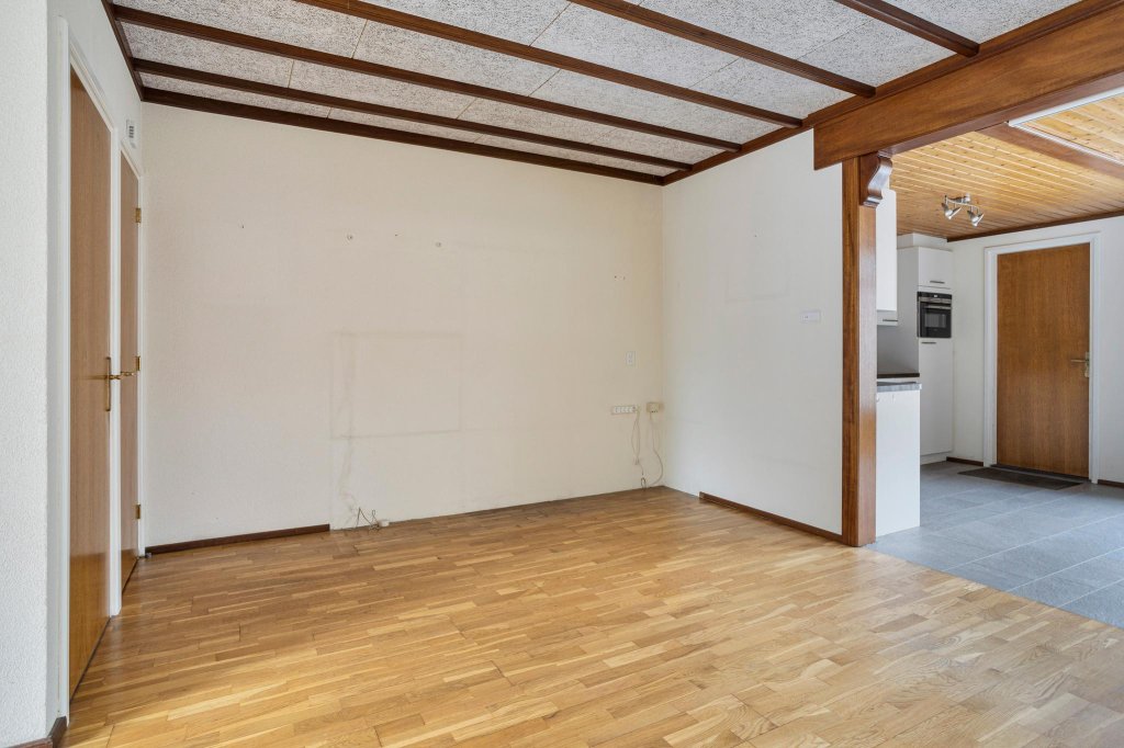 Hall with stairs, spacious living room with bay window, attached open kitchen (2015), utility room with washing machine connection and boiler room, toilet, bathroom with walk-in shower and washbasin (2014).