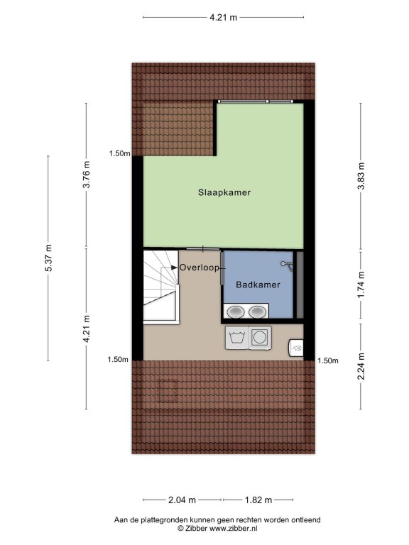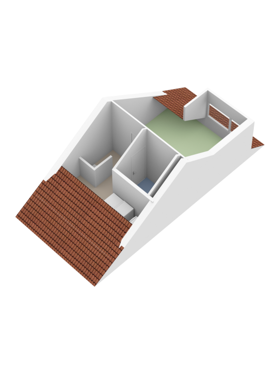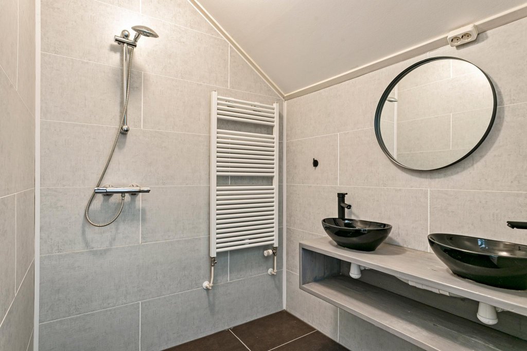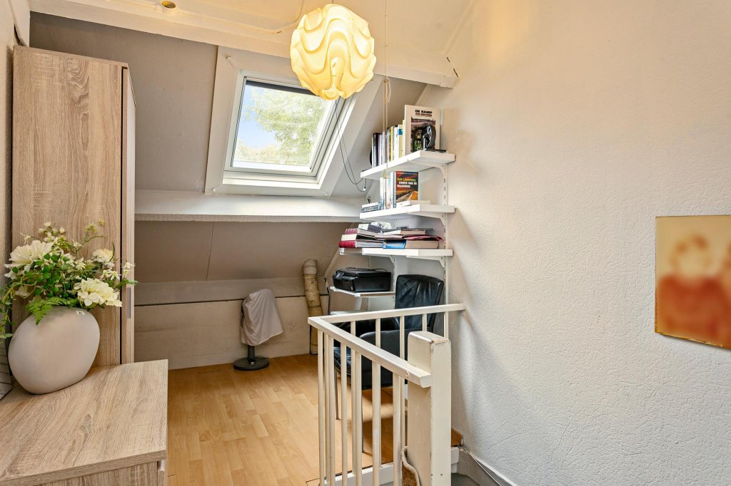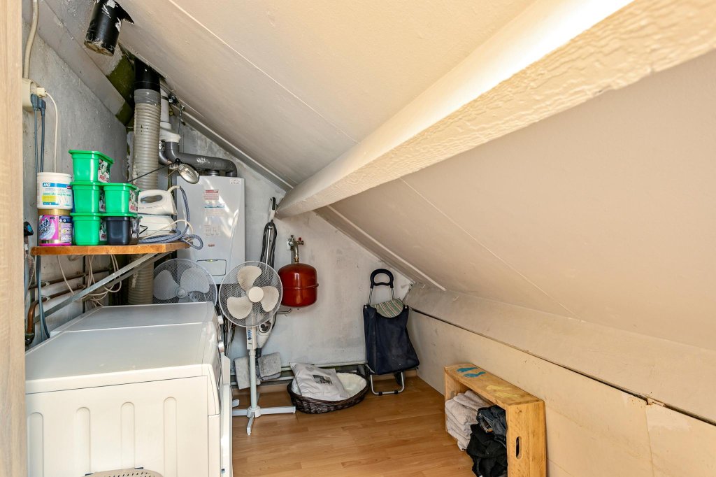 1st floor: landing, 1 bedroom (possibility for 2 (dormer window)), heating system, washing machine connection and a modernized bathroom (2020) with shower and double sink.