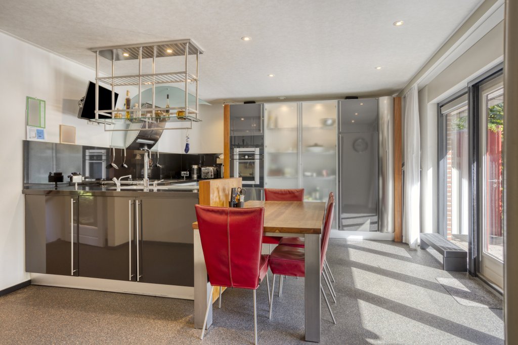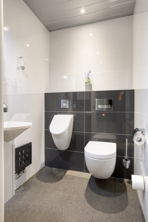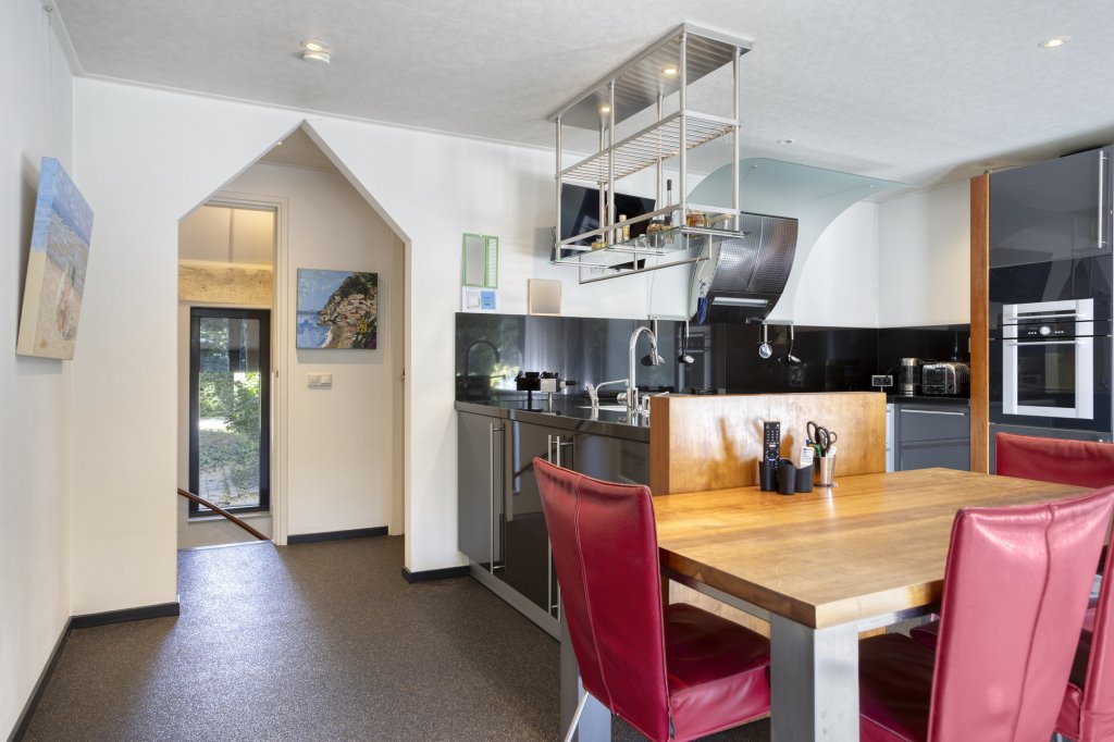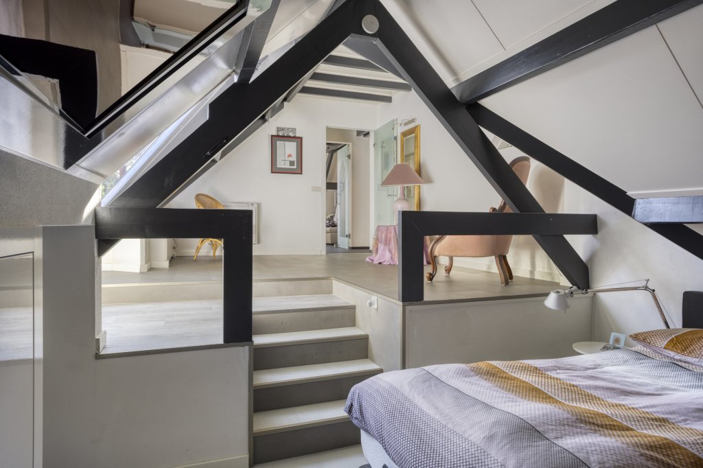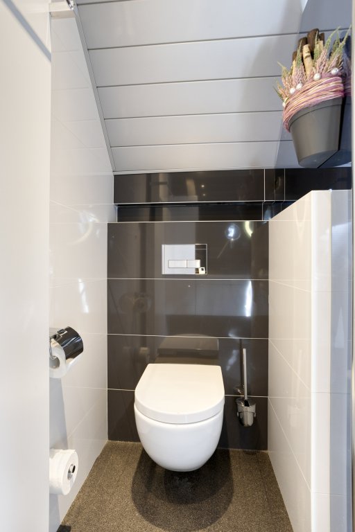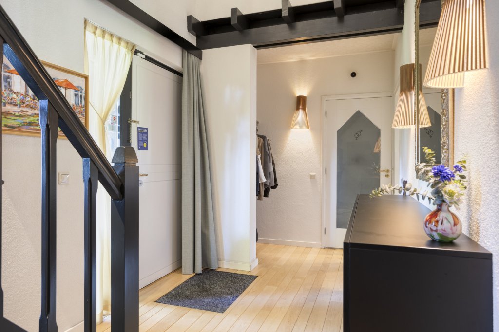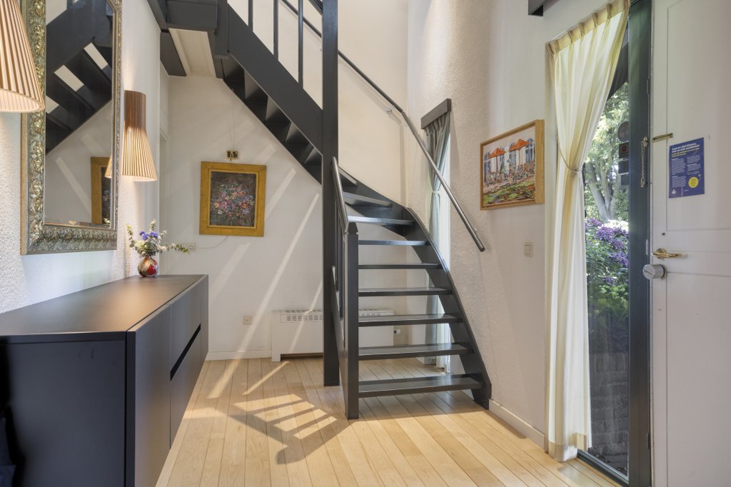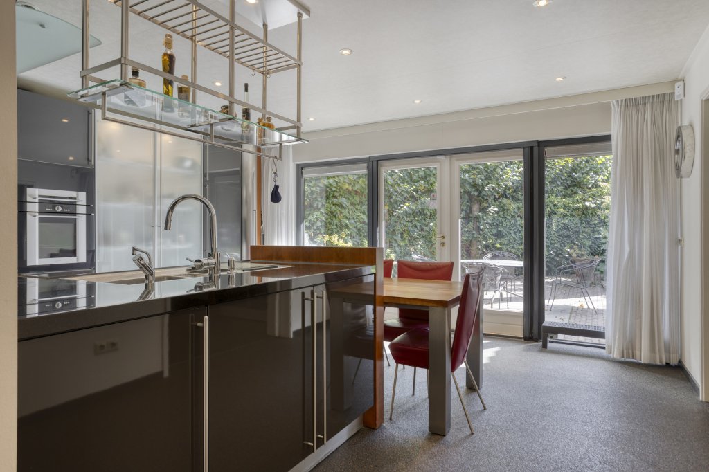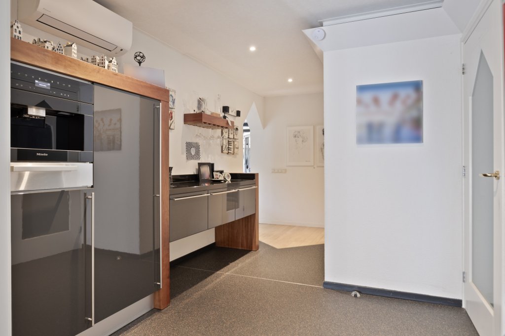 Inside, you are welcomed into an impressive hall with high ceilings and an elegant staircase. The finish is neat and stylish, with wooden flooring and a luxurious toilet with a floating toilet, urinal and modern washbasin. From the hall, you walk through to the spacious kitchen, which consists of two parts. The first part is furnished with plenty of cupboard space and luxury built-in appliances from Miele, including a coffee machine with a warming plate. The adjoining kitchen area, equipped with underfloor heating, offers everything a cooking enthusiast could wish for: from an induction hob and gas wok burner to a Quooker, steam oven and dishwasher.