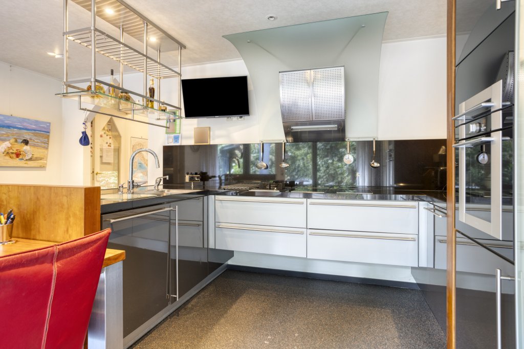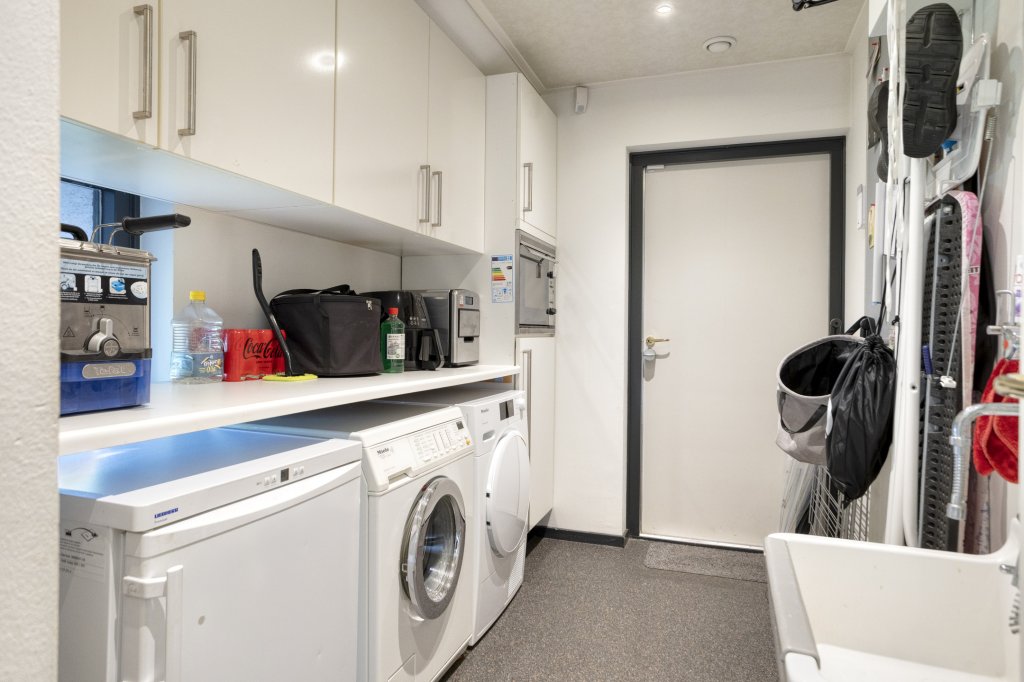 The adjacent utility room is ideal for everyday convenience and is equipped with an extra refrigerator, microwave, freezer and a new washing machine and dryer. Through the side door, you can easily access the enclosed driveway and garden.
