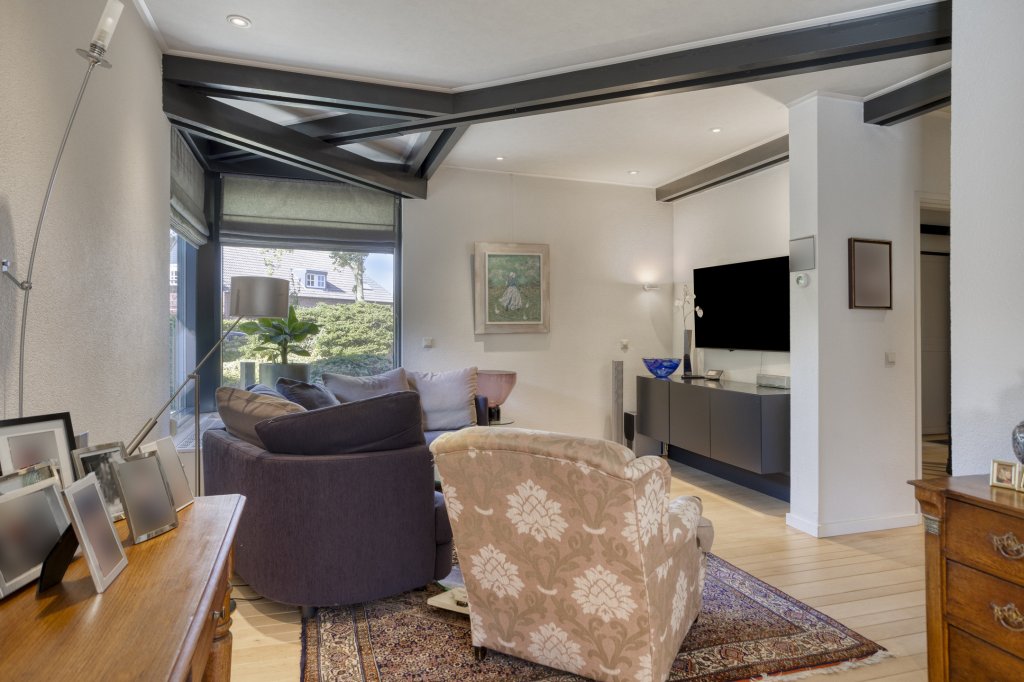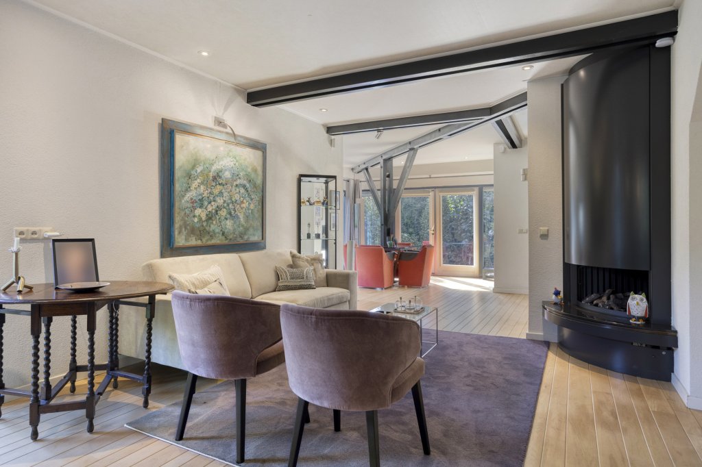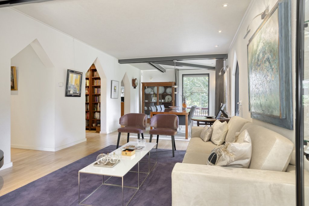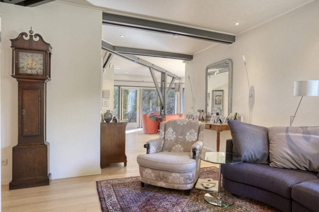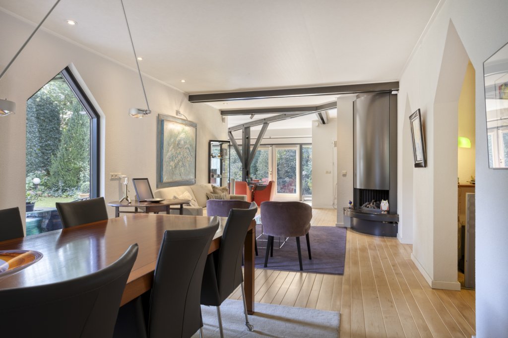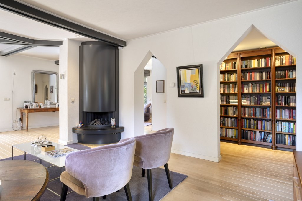 The living room is spacious and inviting, with different places to relax. The dining area can easily accommodate a large group. The sitting area by the fireplace is perfect for winter evenings. On the other side is a lounge area with a television, and the built-in bookcase provides a cosy place to work, read or relax. There is also a fourth seating area, equipped with a small television, which is ideal as a quiet work or reading corner. Thanks to the large windows, the entire space is light and airy, with views of the garden from every room.