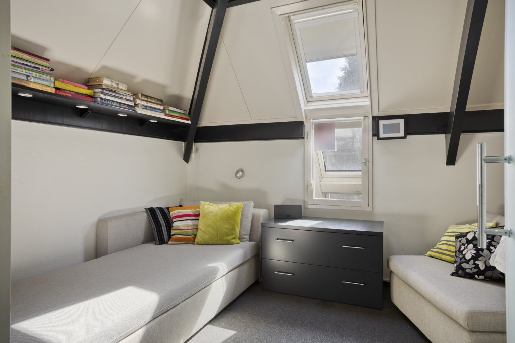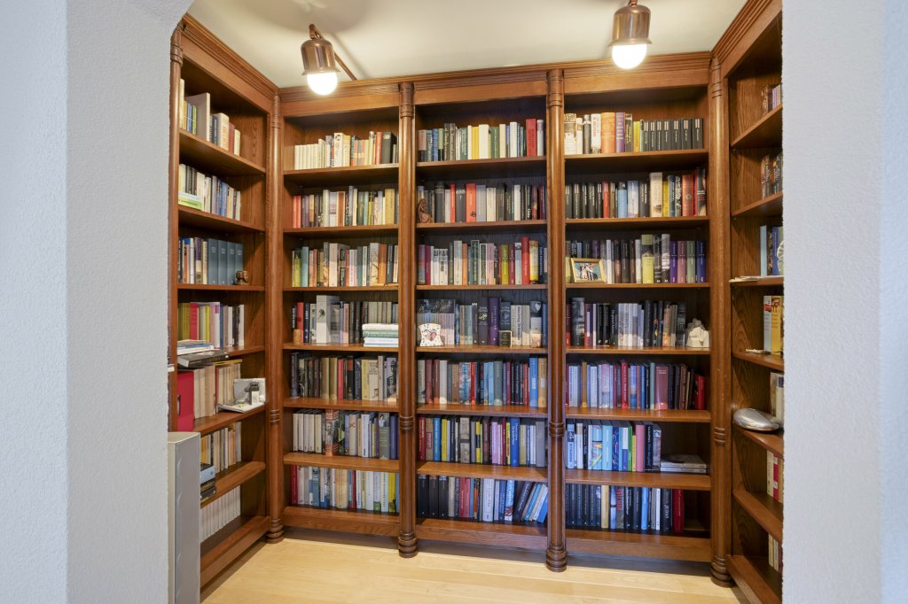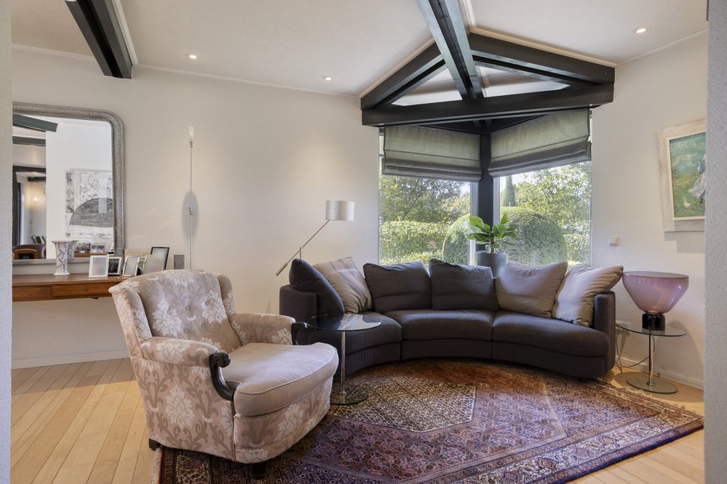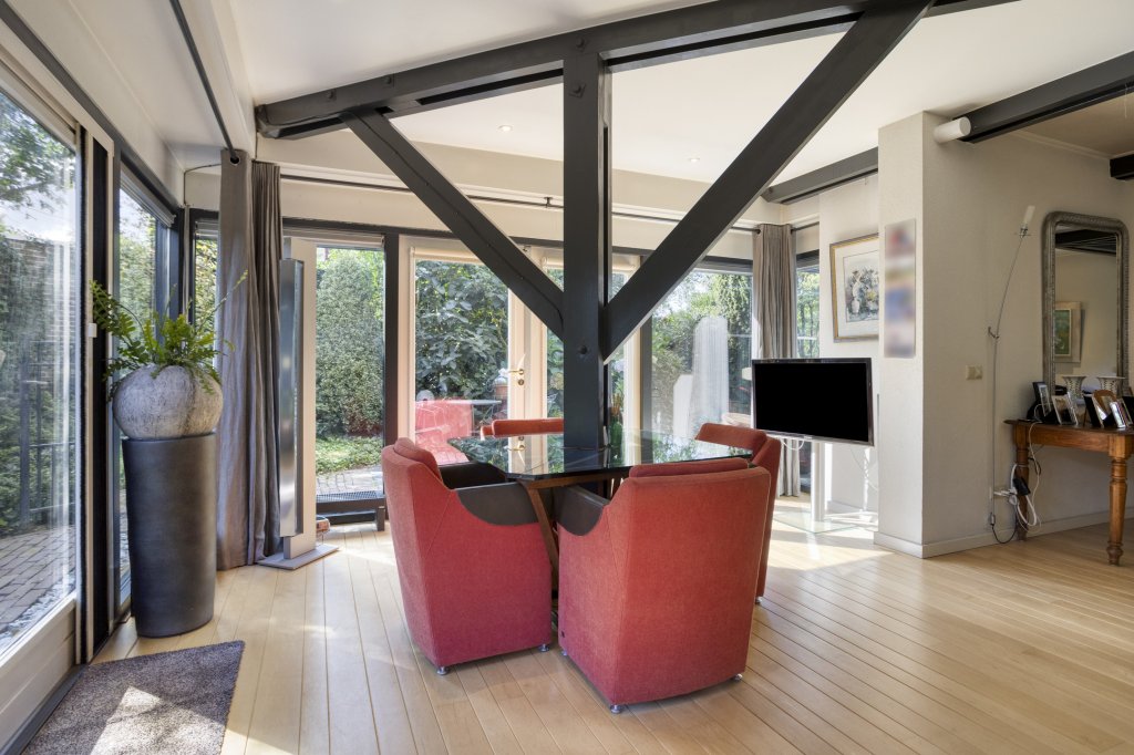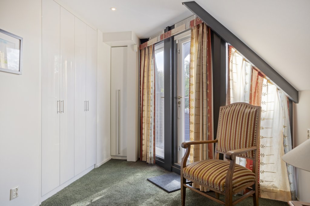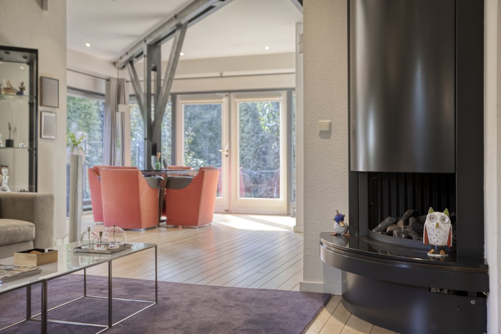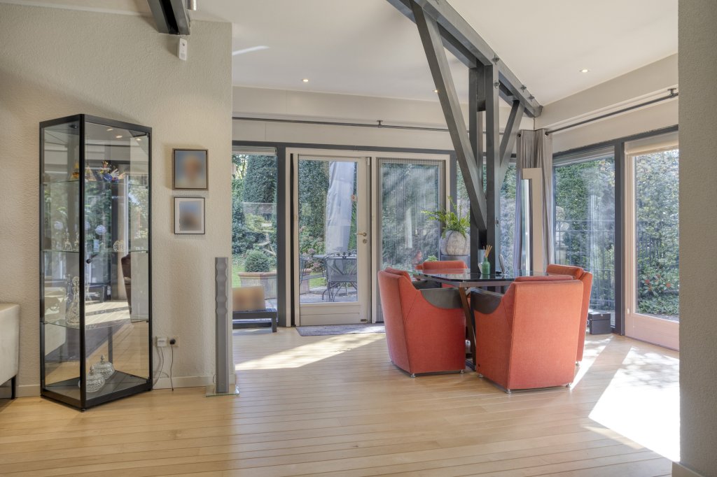 The living room is spacious and inviting, with different places to relax. The dining area can easily accommodate a large group. The sitting area by the fireplace is perfect for winter evenings. On the other side is a lounge area with a television, and the built-in bookcase provides a cosy place to work, read or relax. There is also a fourth seating area, equipped with a small television, which is ideal as a quiet work or reading corner. Thanks to the large windows, the entire space is light and airy, with views of the garden from every room.