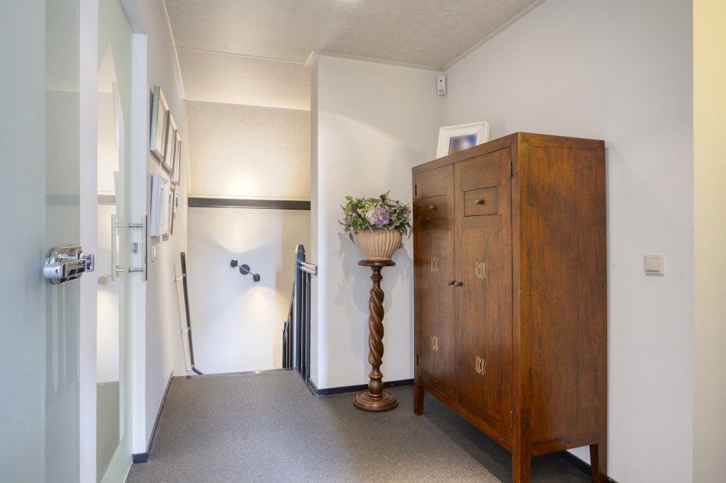 A staircase from the kitchen leads to the basement, which is divided into two sections. The first room is furnished as an attractive wine cellar with a tasting area; a wonderful place to enjoy a drink or show off your collection. The second section is ideal as a gym, hobby room or playroom. In addition, the house has a spacious indoor garage with a cast floor, plenty of storage space and an extensive meter cupboard.