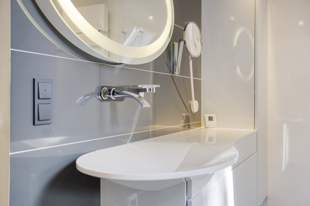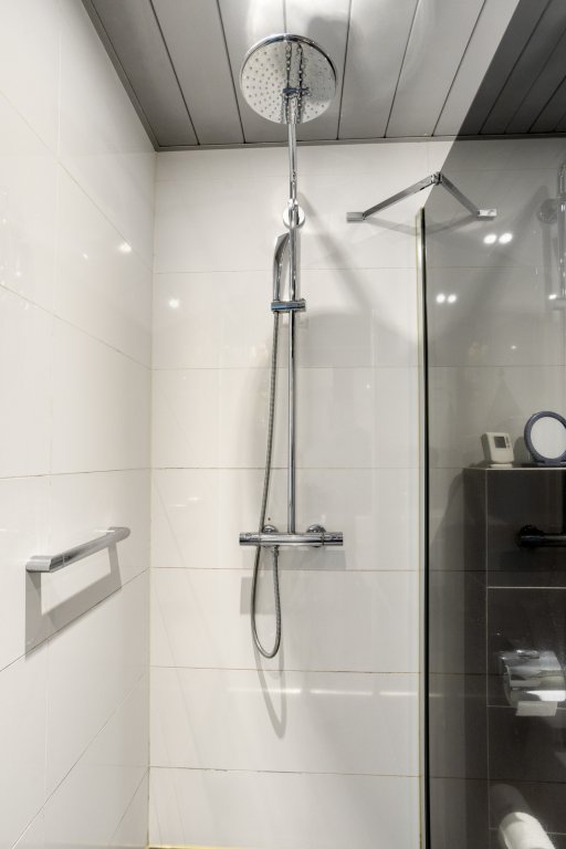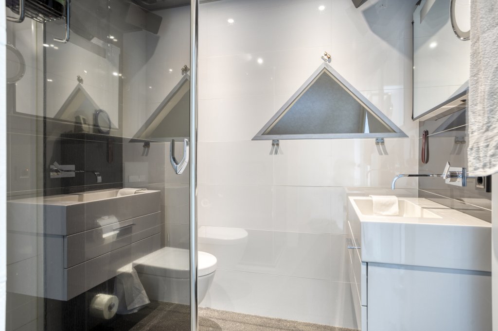The main bathroom has a luxurious finish and is equipped with a bathtub, spacious walk-in shower with natural stone seat, floating toilet and a designer washbasin. A second bathroom is also available and has a shower, toilet and washbasin.