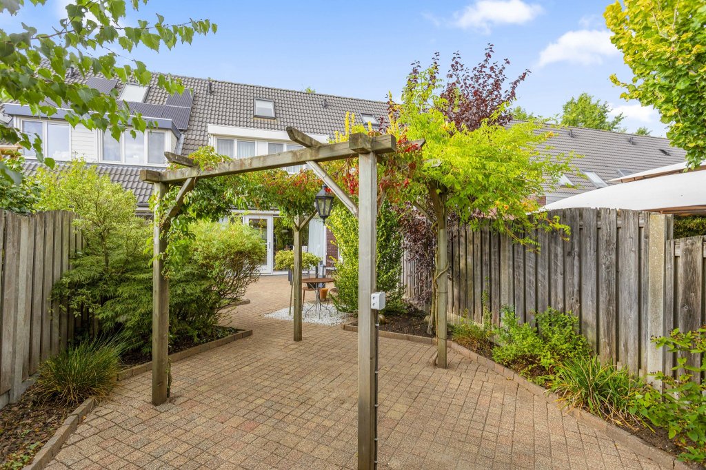 The back garden can be reached from the living room. This is no less than 16 meters deep, spacious enough for a cozy sitting area and more. The back garden is finished with decorative paving, a plant border and a wooden garden shed with electricity, and a delightful canopy over the full width of the garden.