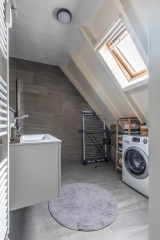 The bathroom is equipped with a sink and walk-in shower. You will also find the washing machine connection in the bathroom.
