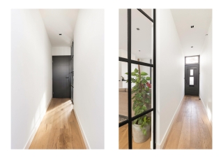 Entrance hall with stairs cupboard. Fantastic steel interior door to the living room. The spacious living room has a beautiful wooden floor and black wooden blinds. From the dining area you have access to the first floor, the basement and the kitchen. The modern kitchen is equipped with a 5-burner gas hob with extractor hood, dishwasher, fridge with freezer and combi oven. Behind the kitchen is a practical utility room with washing machine / dryer connection and a modern toilet.